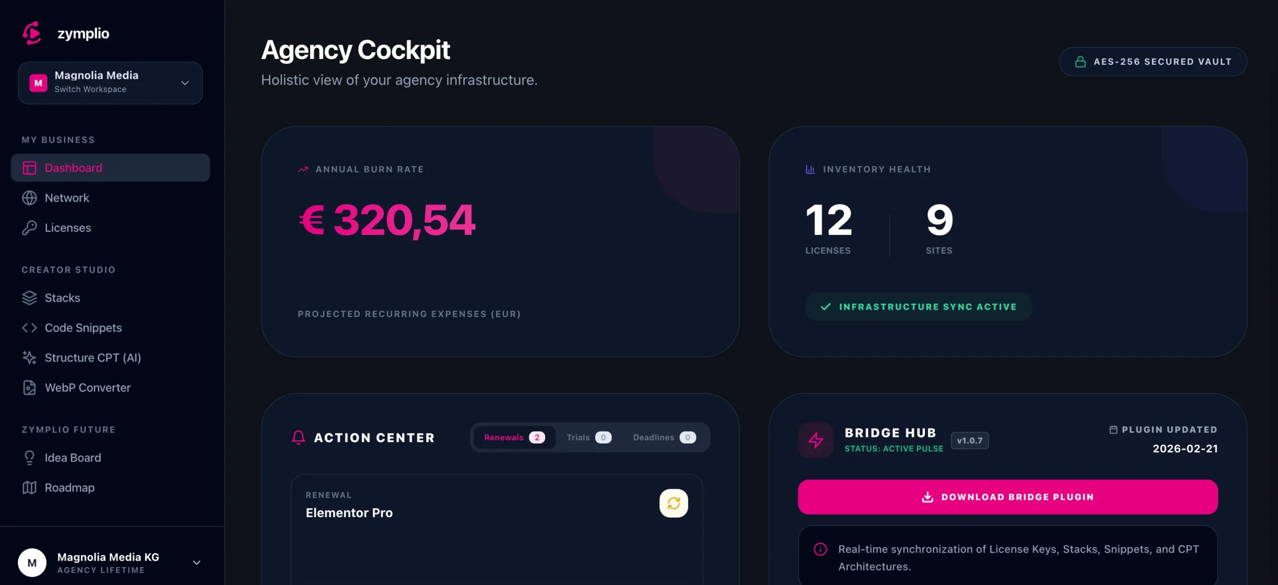 The Bridge feature, which allows for the targeted rollout of Stacks and keys to new projects, makes the tool even more valuable by saving significant time and effort.Additional features like Code Snippets, CPT, and the WebP Converter round out zymplio as a perfect central management hub. Plus, any questions are always answered quickly via email."